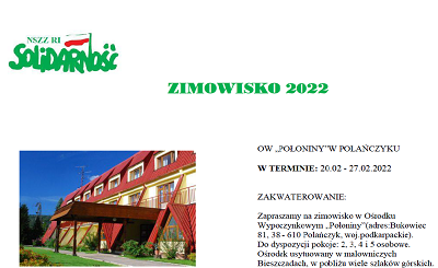 NSZZ RI „Solidarność" organizuje zimowisko dla dzieci rolników ubezpieczonych w KRUS dofinansowane przez Fundusz Składkowy Ubezpieczenia Społecznego Rolników.
