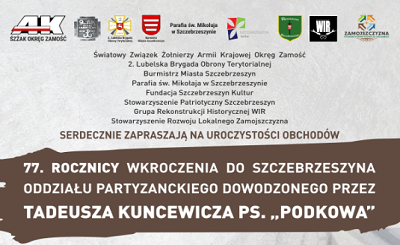 Światowy Związek Żołnierzy Armii Krajowej Okręg Zamość zaprasza na obchody 77. rocznicy wkroczenia do Szczebrzeszyna Oddziału AK dowodzonego przez Tadeusza Kuncewicza ps. „Podkowa. Szczegóły na plakatach.
