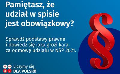 Przypominamy, że że udział w spisie powszechnym jest obowiązkowy. Obowiązek udziału w spisie powszechnym został uregulowany w art. 6 ust. 3 i art. 9 ust. 1 ustawy o statystyce publicznej (Dz. U z 2021 r. poz. 955).