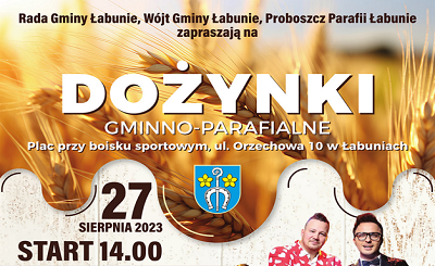 Rada Gminy Łabunie, Wójt Gminy Łabunie - Mariusz Kukiełka oraz Proboszcz Parafii w Łabuniach zapraszają na Dożynki. Szczegóły na plakacie.