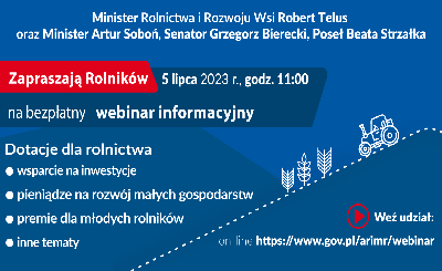 Agencja Restrukturyzacji i Modernizacji Rolnictwa zaprasza na webinar „Dotacje dla rolnictwa”. Szczegóły na plakacie.