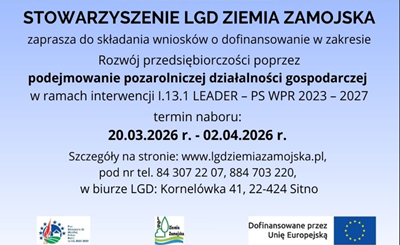 Stowarzyszenie LGD Ziemia Zamojska zaprasza do składania wniosków w zakresie podejmowania działalności gospodarczej.