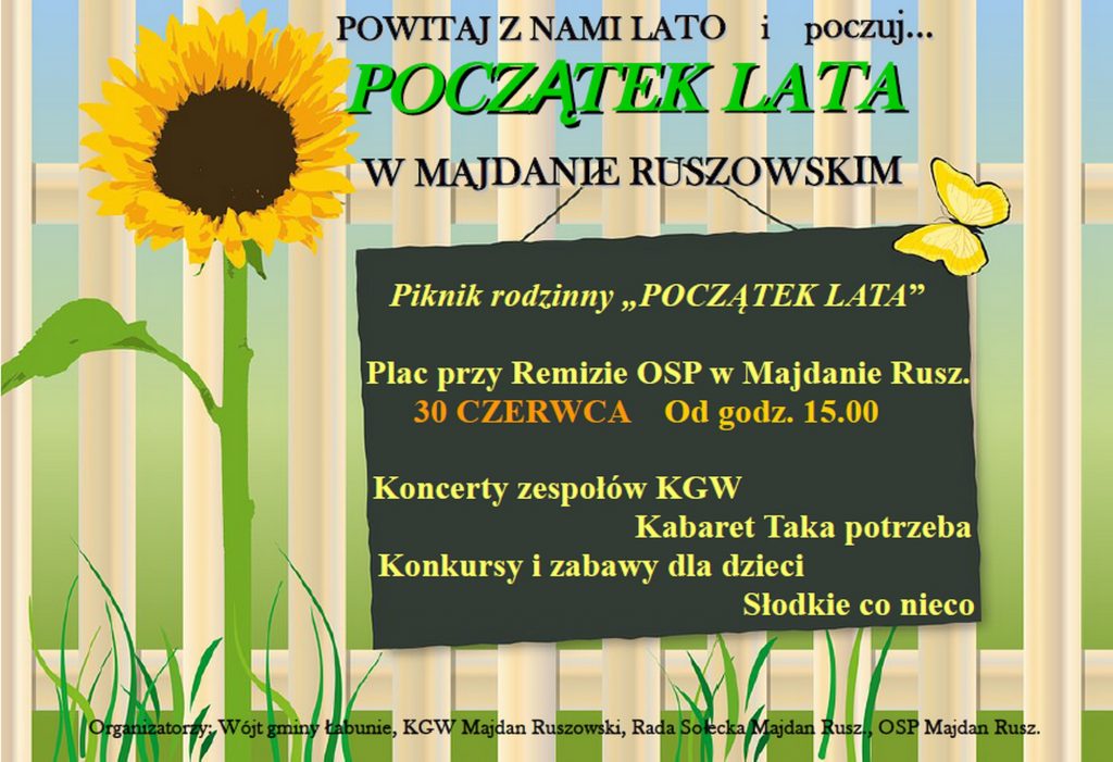 …w Majdanie Ruszowskim. W urokliwej wiosce z zielonymi łanami pól i lasami usadowionymi na wyżynach będącej bramą na Roztocze już 30 czerwca odbędzie się impreza pt. “Początek lata”. To jak zwykle dużo muzyki, w tym folkowej i ludowej, to swojskie jadło i domowe wypieki. Zapraszamy mieszkańców gminy Łabunie i turystów, którzy urlopując się na Roztoczu, mogą wstąpić na wydarzenie, które pokazuje, jak bawią się i integrują “lokalsi”. Szczegóły na plakacie.