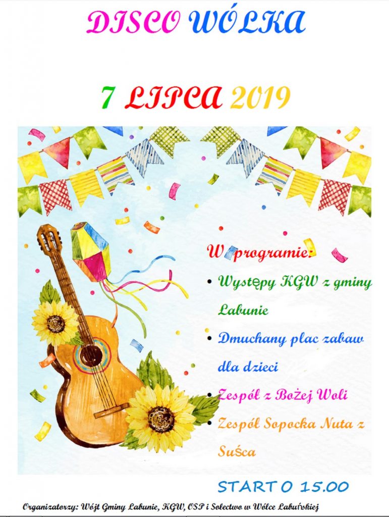 Koło Gospodyń Wiejskich w Wólce Łabuńskiej zaprasza na Disco Wólka. Szczegóły na plakacie