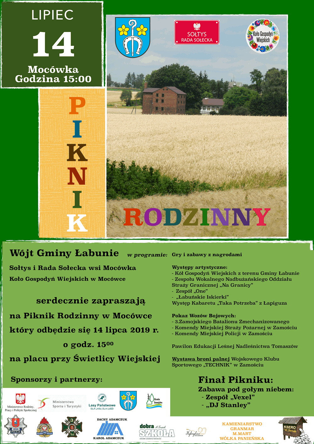 Pokazy wozów bojowych, wystawa broni palnej, pawilon edukacji leśnej, gry i zabawy z nagrodami, występy zespołów, słodkie wypieki i swojskie jadło a do tego mega disco pod gwiazdami z zespołem Vexel I DJ’em Stanley’em Rezerwujcie niedzielne popołudnie – 14 lipca i koniecznie zajrzyjcie na dłużej do Mocówki na Piknik Rodzinny. Taką moc atrakcji szykuje dla Państwa Wójt Gminy Łabunie, Sołtys i Rada Sołecka wsi Mocówka oraz Koło Gospodyń Wiejskich w Mocówce. Impreza rozpocznie się o godzinie 15.00 na placu przy Świetlicy Wiejskiej.