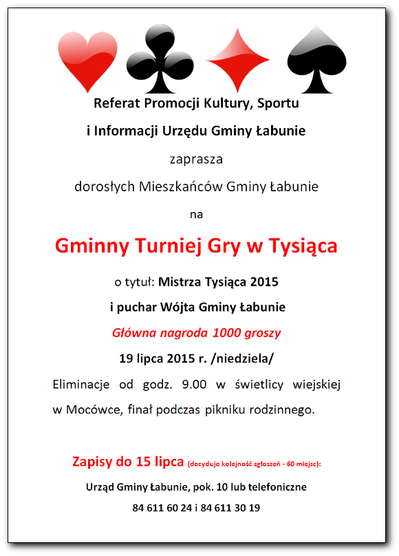 W niedzielę, 19 lipca, w Mocówce odbędzie się II Gminny Turniej Gry w Tysiąca dla mieszkańców gminy Łabunie. Najlepszy gracz zdobędzie tytuł Gminnego Mistrza Tysiąca 2015, puchar Wójta Gminy Łabunie i nagrodę pieniężną – tysiąc groszy.