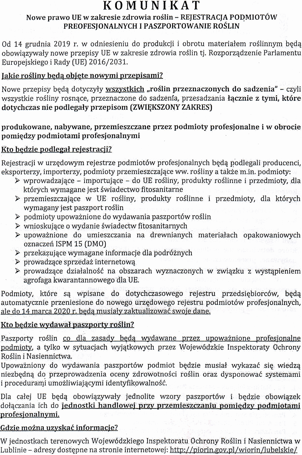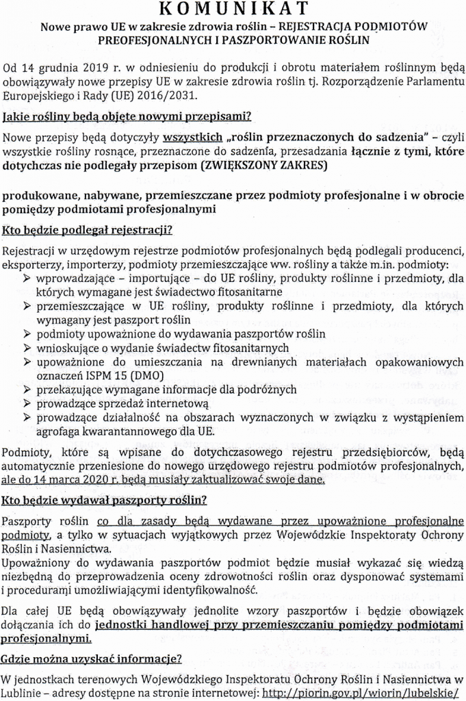 Wojewódzki Inspektorat Ochrony Roślin i Nasiennictwa w Lublinie informuje, że w dniu 14 grudnia 2019 r. wchodzi w życie Rozporządzenie Parlamentu i Rady (UE) 2017/625 w sprawie kontroli urzędowych i innych czynności urzędowych (…) oraz Rozporządzenie Parlamentu i Rady (UE) 2016/2031 w sprawie zdrowia roślin.