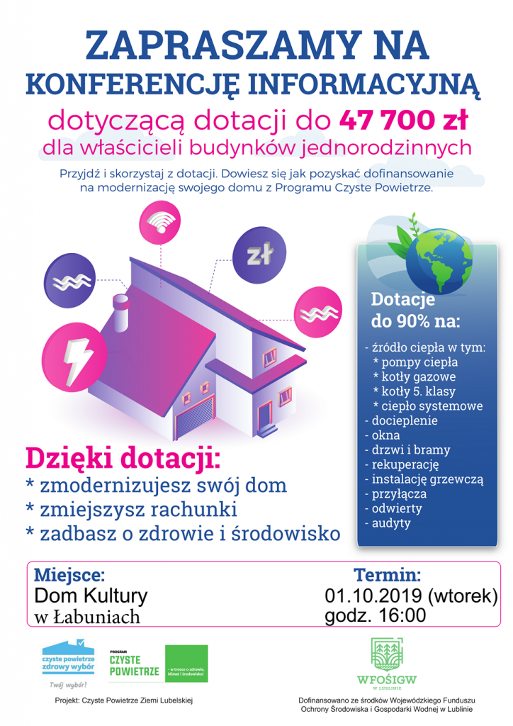 W dniu 1 października 2019 (wtorek) o godzinie 16.00 w Domu Kultury w Łabuniach odbędzie się spotkanie informacyjne dla osób, które chcą pozyskać środki na dofinansowanie – nawet do 90% – z programu „Czyste Powietrze”.