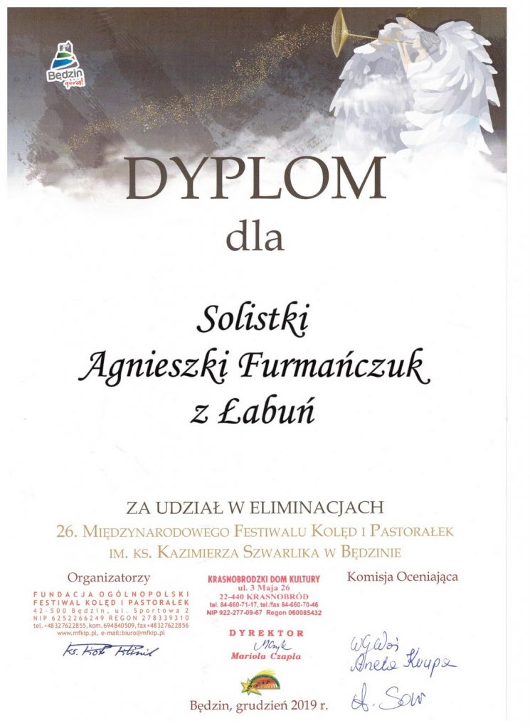 W sobotę 14 grudnia 2019 r. w Krasnobrodzkim Domu Kultury odbyły się Eliminacje Rejonowe XXVI Międzynarodowego Festiwalu Kolęd i Pastorałek im. Ks. Kazimierza Szwarlika – Będzin 2020. W eliminacjach wzięło udział 27 podmiotów wykonawczych, spośród których zdecydowaną większość stanowili soliści. Gminę Łabunie reprezentowała solistka – Pani Agnieszka Furmańczuk i wykonała dwa utwory: kolędę “Lulajże Jezuniu” i “Kolędę dla Nieobecnych”.