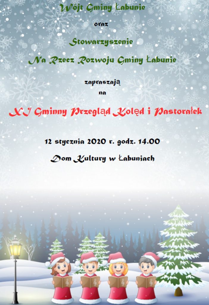 Co prawda już po świętach, a aura za oknem nie nastraja do podziwiania prawdziwej zimy, ale mimo to już teraz zapraszamy na wspólne stworzenie ponownego, świątecznego klimatu w Łabuniach. Wyjdźmy z domu i spotkajmy się 12 stycznia o godz. 14.00 w Domu Kultury w Łabuniach na XI Gminnym Przeglądzie Kolęd i Pastorałek. Wystąpi ponad 20 wykonawców, w tym zespoły i soliści.