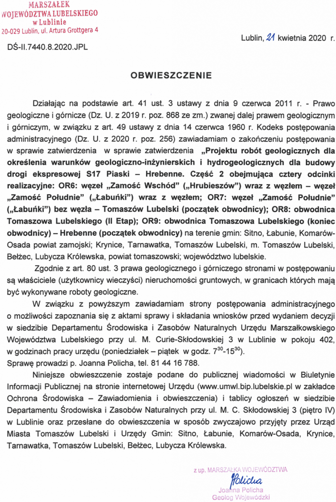 Marszałek Województwa Lubelskiego zawiadamia o zakończeniu postępowania w sprawie zatwierdzenia projektu robót geologicznych dla określenia warunków geologiczno-inżynierskich i hydrogeologicznych dla budowy drogi ekspresowej S17 Piaski – Hrebenne, część 2 obejmująca cztery odcinki realizacyjne: OR6, OR7, OR8 i OR9.