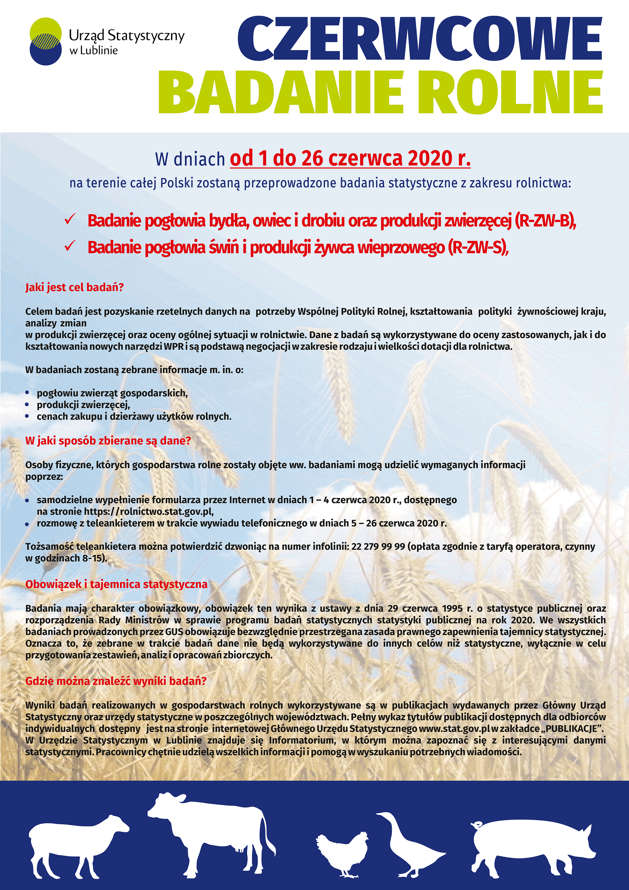 Zgodnie z Programem Badań Statystycznych Statystyki Publicznej na rok 2020 Główny Urząd Statystyczny realizuje badania rolnicze: badanie pogłowia bydła, owiec i drobiu oraz produkcji zwierzęcej a także badanie pogłowia świń oraz produkcji żywca wieprzowego w wylosowanych gospodarstwach rolnych na terenie całego kraju.