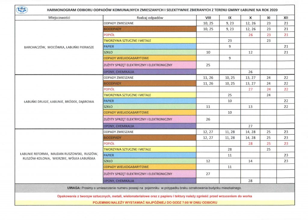 Poniżej zamieszczamy harmonogram wywozu śmieci do końca 2020 roku.