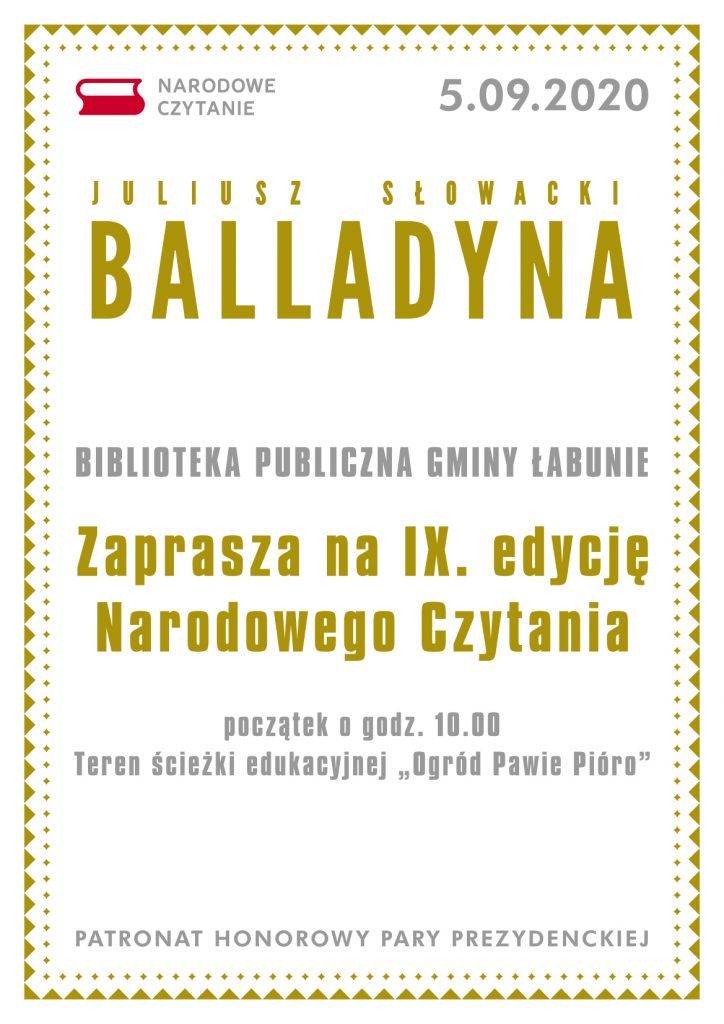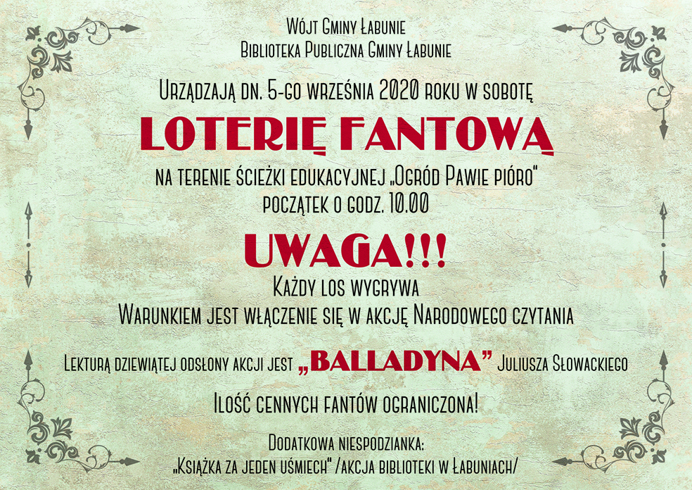 Wójt Gminy Łabunie oraz Biblioteka Publiczna Gminy Łabunie zapraszają 5 września 2020 r. na IX edycję Narodowego Czytania oraz Loterię Fantową.