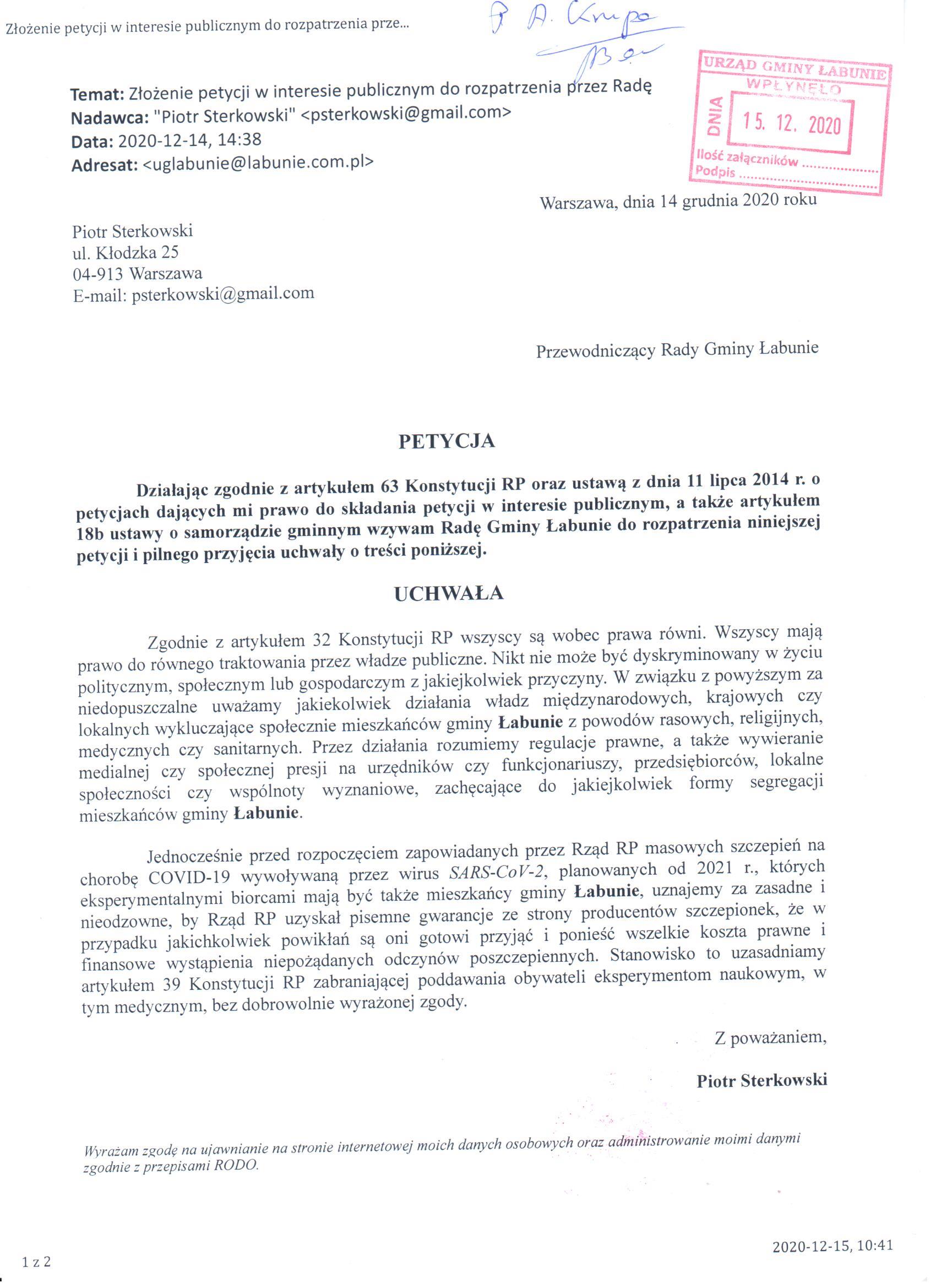 Wójt Gminy Łabunie informuje, że 15 grudnia 2020 r. do Urzędu Gminy Łabunie wpłynęły do rozpatrzenia przez Radę Gminy Łabunie dwie petycje w interesie publicznym.