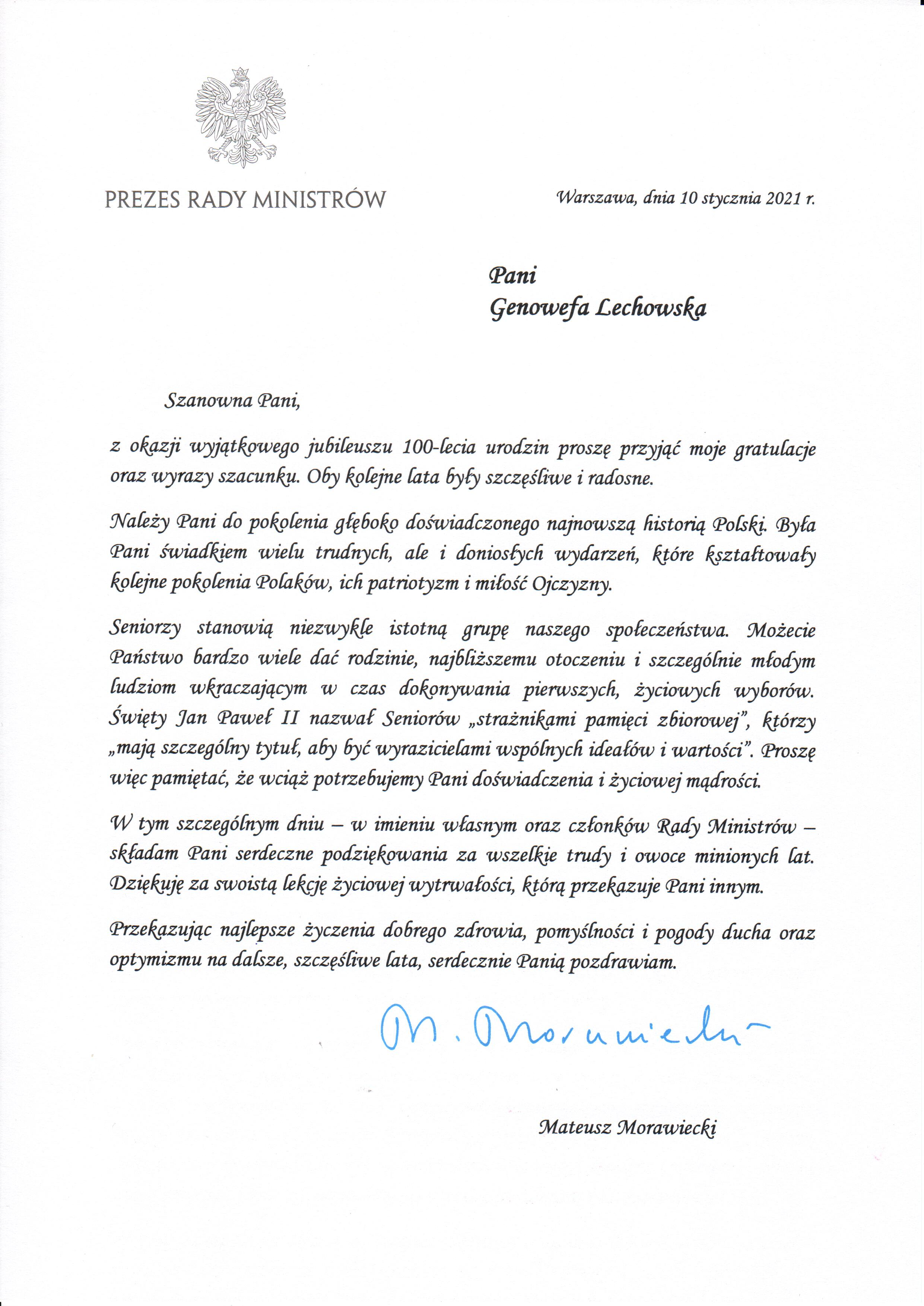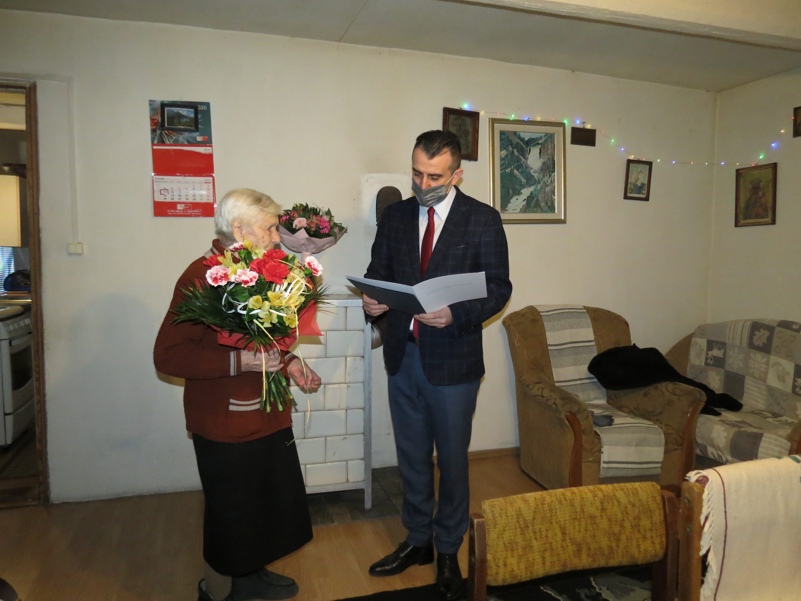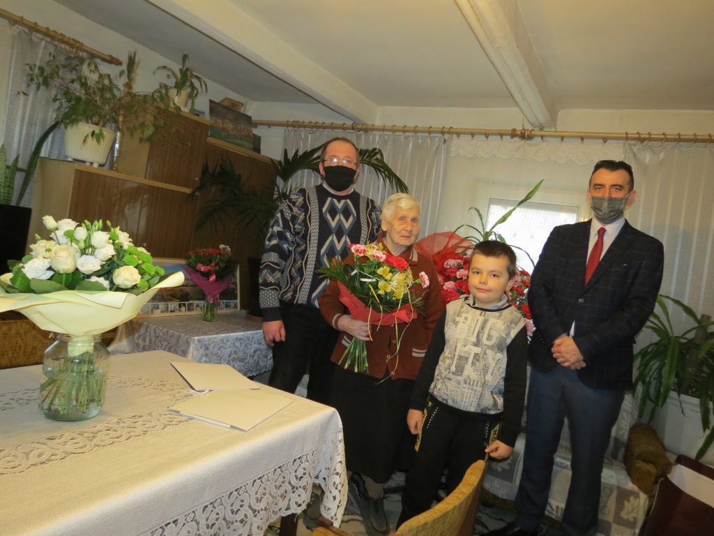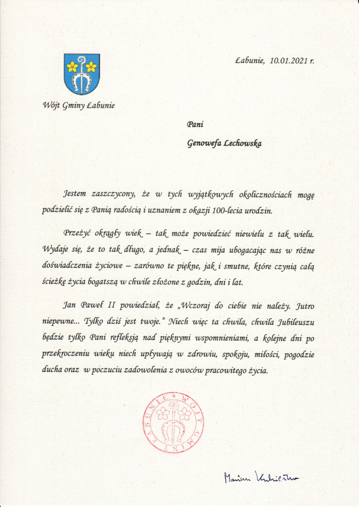 Życzenia jubilatce złożył Wójt Gminy Łabunie, Mariusz Kukiełka. Najstarsza mieszkanka gminy otrzymała bukiet kwiatów i prezent. Jubilatka dostała również list gratulacyjny od Prezesa Rady Ministrów oraz okolicznościowe życzenia od Wójta Gminy Łabunie.