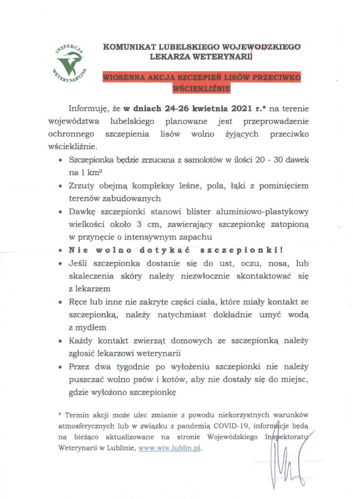 Poniżej zamieszczamy informację o akcji szczepienia lisów.