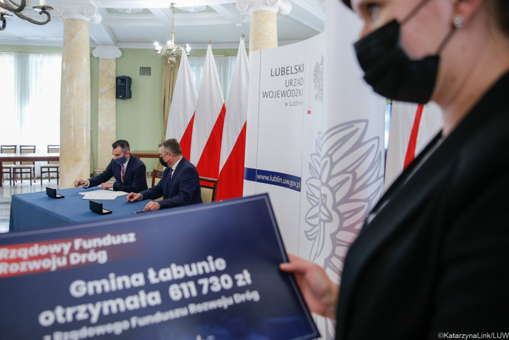 W środę, 23 czerwca Wójt Gminy Łabunie – Mariusz Kukiełka podpisał umowę na dofinansowanie przeznaczone na przebudowę ul. Kościelnej w Łabuniach. Symboliczne czeki wręczył wojewoda lubelski Lech Sprawka. Gmina Łabunie otrzymała ponad 600 tys. zł finansowego wsparcia. Dzięki niemu jeszcze w tym roku drogowcy położą nową nawierzchnię na odcinku 855 m (na trasie od kościoła do skrzyżowania z drogą krajową nr 17). Również na takiej samej długości zostanie przebudowany chodnik.