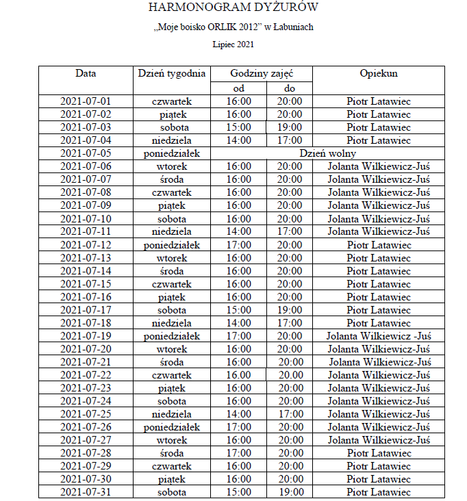 Przedstawiamy harmonogram otwarcia boiska Orlik w Łabuniach. Zapraszamy do aktywnego spędzania wakacji.