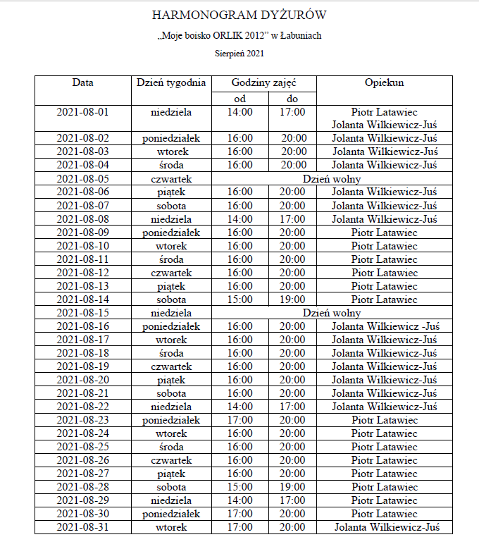 Publikujemy harmonogram otwarcia boiska Orlik w Łabuniach na sierpień 2021.