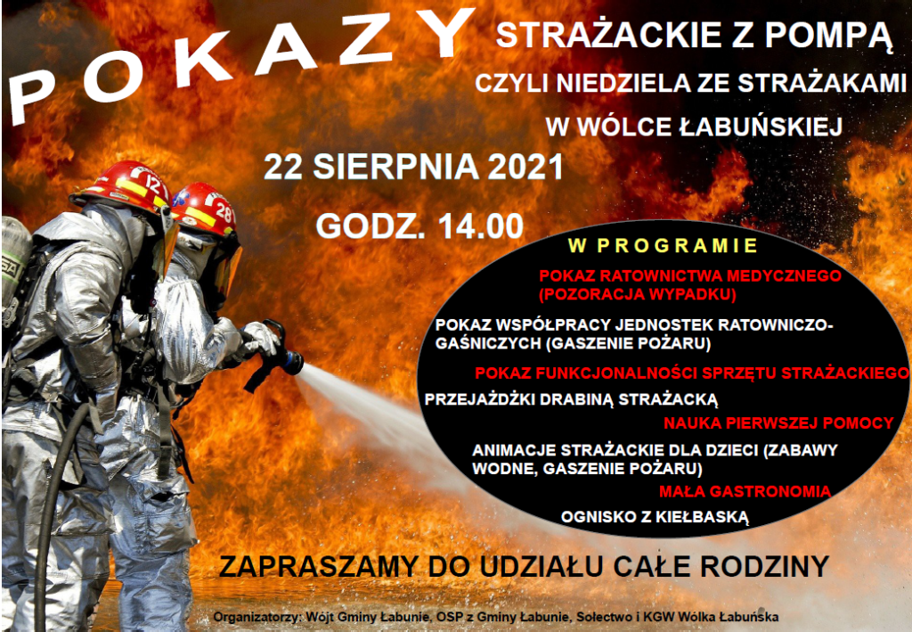 Pokazy, przejażdżki, animacje i poczęstunek. Tak będzie na pikniku strażackim w Wólce Łabuńskiej. Już w najbliższą niedzielę od godz. 14.00 gorące emocje zapewnią strażacy z OSP z gminy Łabunie, a o podniebienia zadba Koło Gospodyń Wiejskich w Wólce Łabuńskiej.