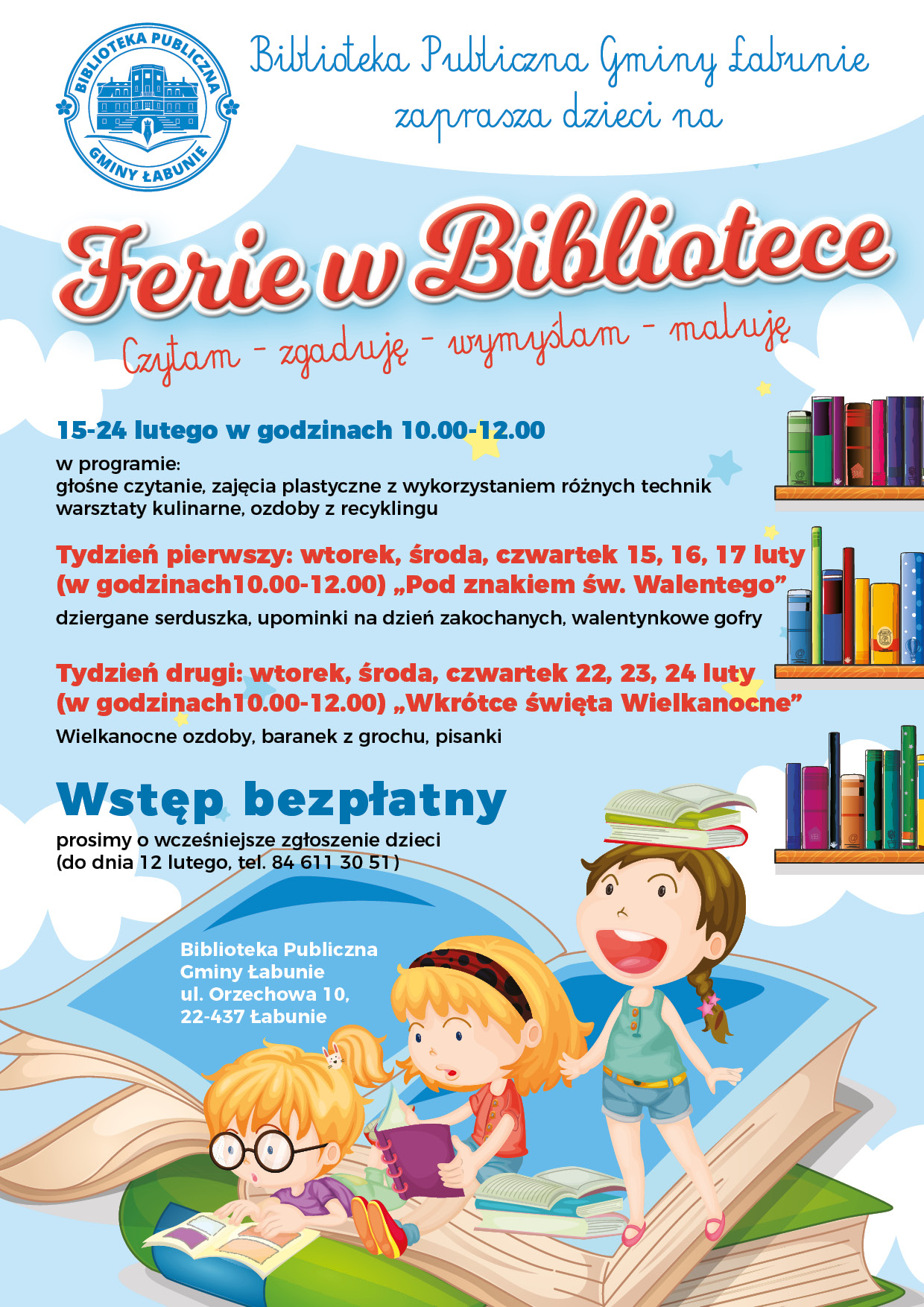 Biblioteka Publiczna Gminy Łabunie zaprasza na “Ferie w Bibliotece”. W tym roku pod hasłem “Czytam – zgaduję – wymyślam – maluję” w dniach od 15 do 24 lutego przeprowadzone zostaną bezpłatne zajęcia dla dzieci. Zgłoszenia: do 12 lutego pod nr tel. 84 611 30 51. Szczegóły na plakacie poniżej.