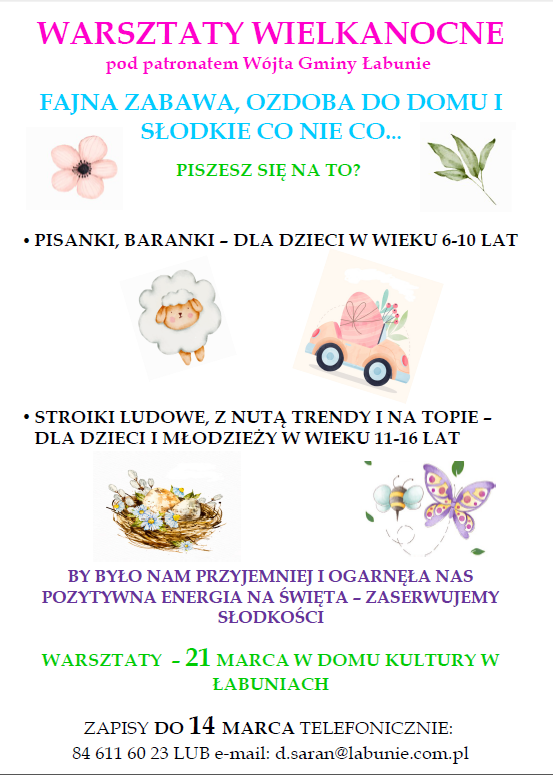 Zapraszamy mieszkańców gminy Łabunie na Gminne Warsztaty Wielkanocne.