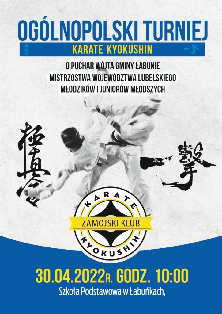 W sobotę, 30 kwietnia 2022 r. zapraszamy do hali sportowej w Zespole Szkolno-Przedszkolnym w Łabuńkach Pierwszych na Ogólnopolski Turniej Karate Kyokushin o Puchar Wójta Gminy Łabunie i Mistrzostwa Województwa Lubelskiego Młodzików i Juniorów Młodszych. Start zawodów o godz. 10.