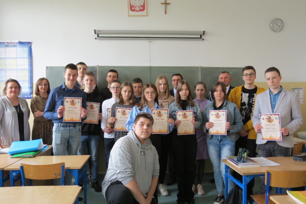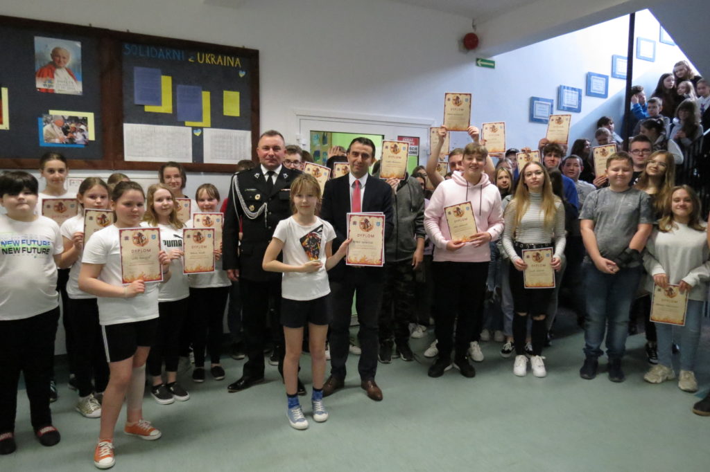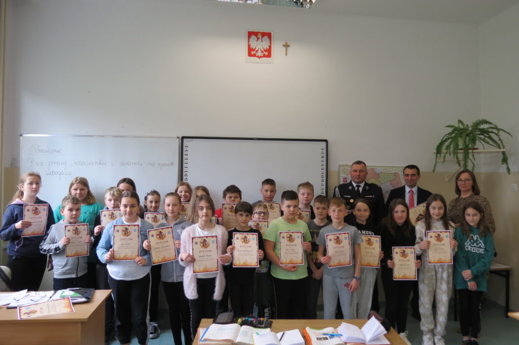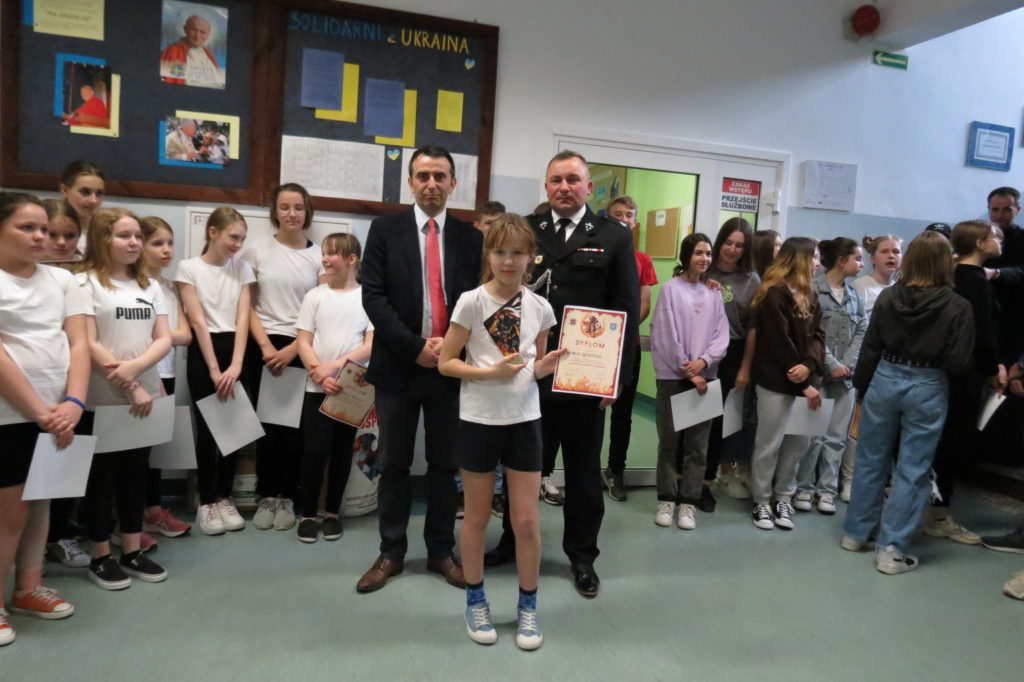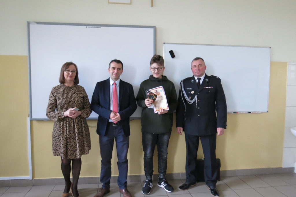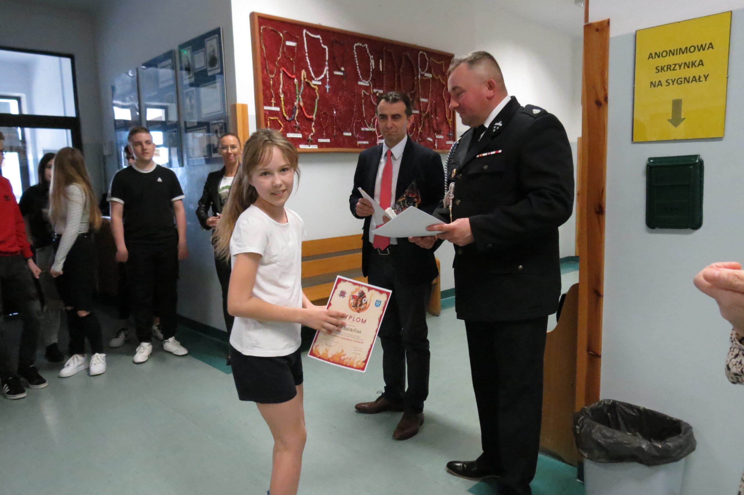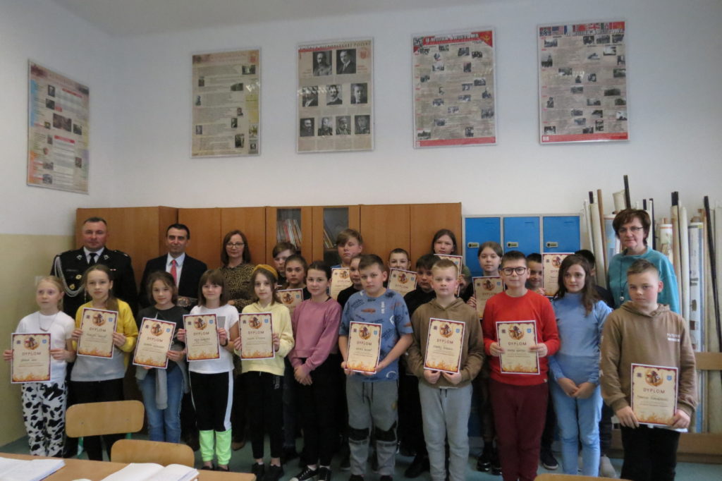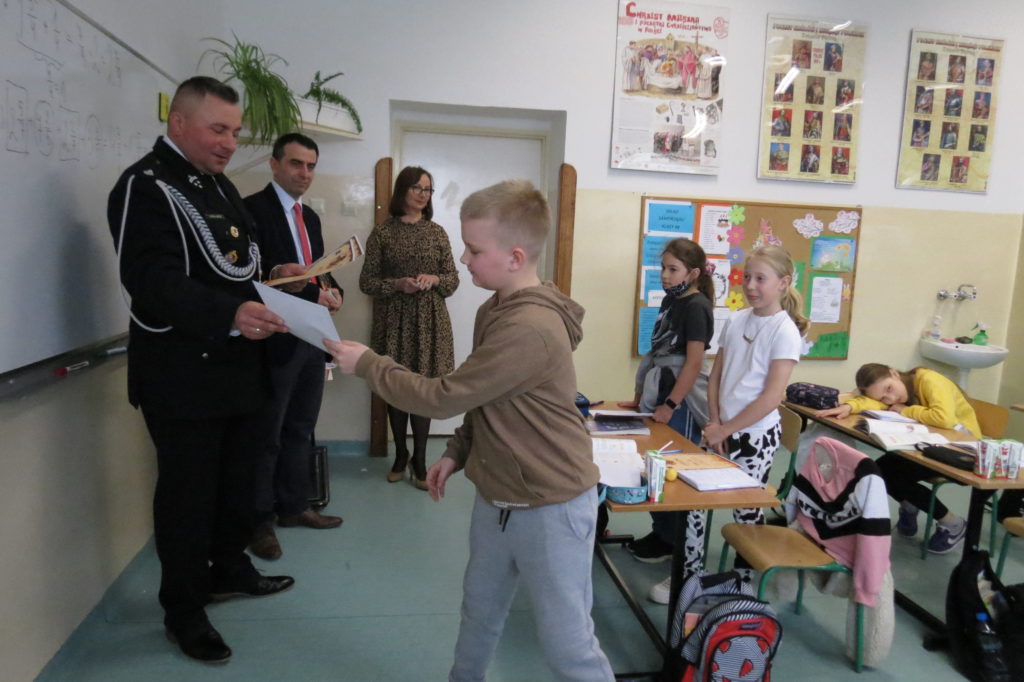 Wręczenie nagród uczestnikom gminnego etapu konkursu odbyło się we wtorek, 26 kwietnia. Dyplomy otrzymali wszyscy uczniowie biorący udział w eliminacjach, a zwycięzcy reprezentujący gminę Łabunie na etapie powiatowym – również statuetki. Wręczali je: Wójt Gminy Łabunie – Mariusz Kukiełka oraz Komendant Gminny OSP – Paweł Mróz.