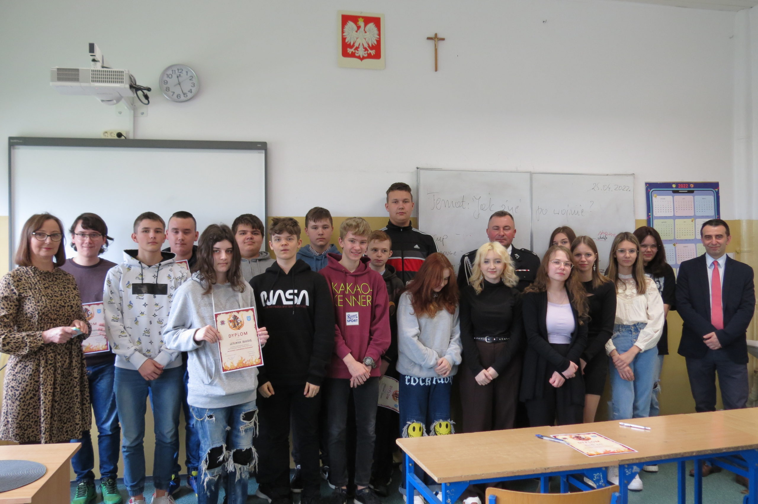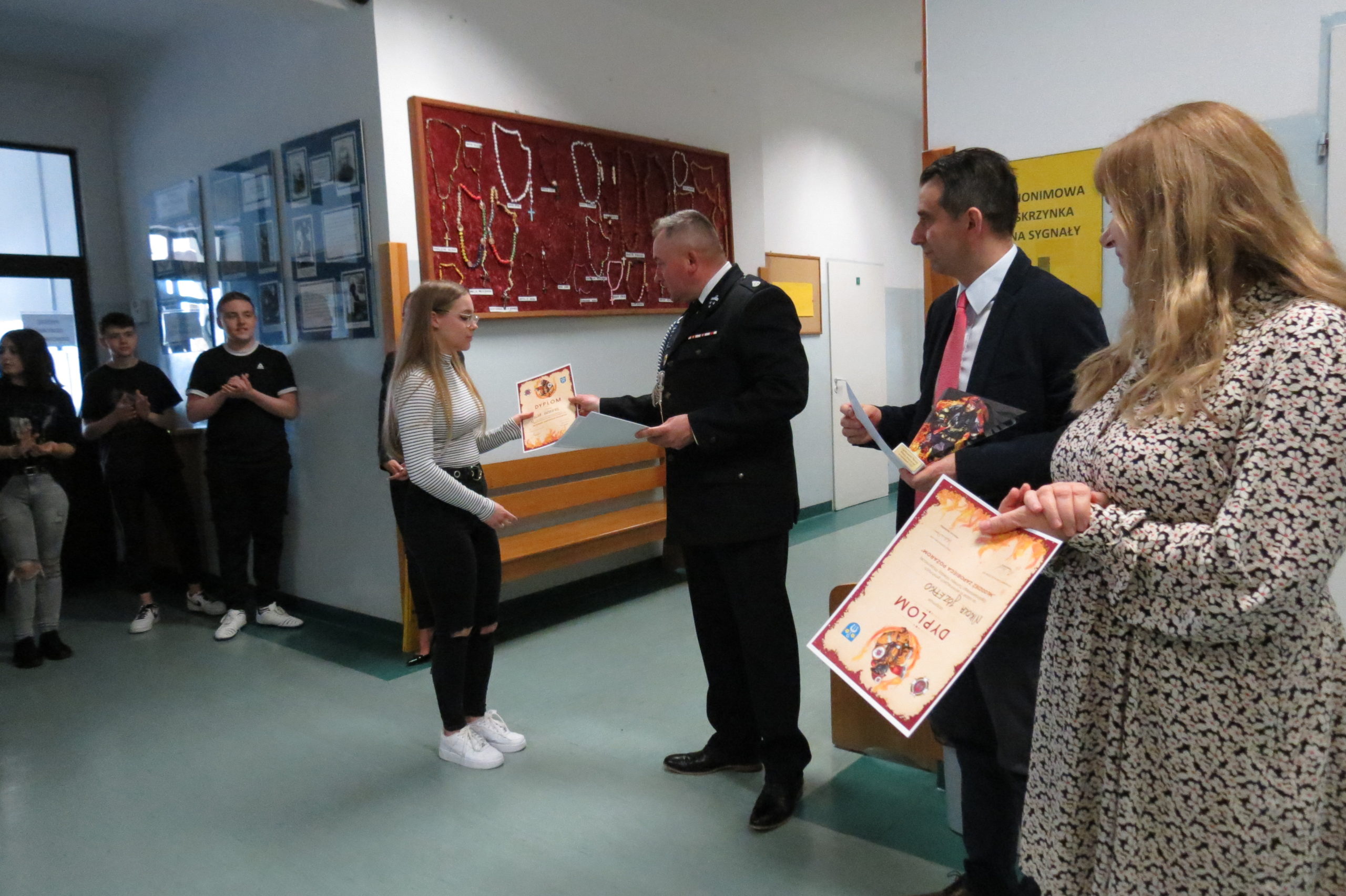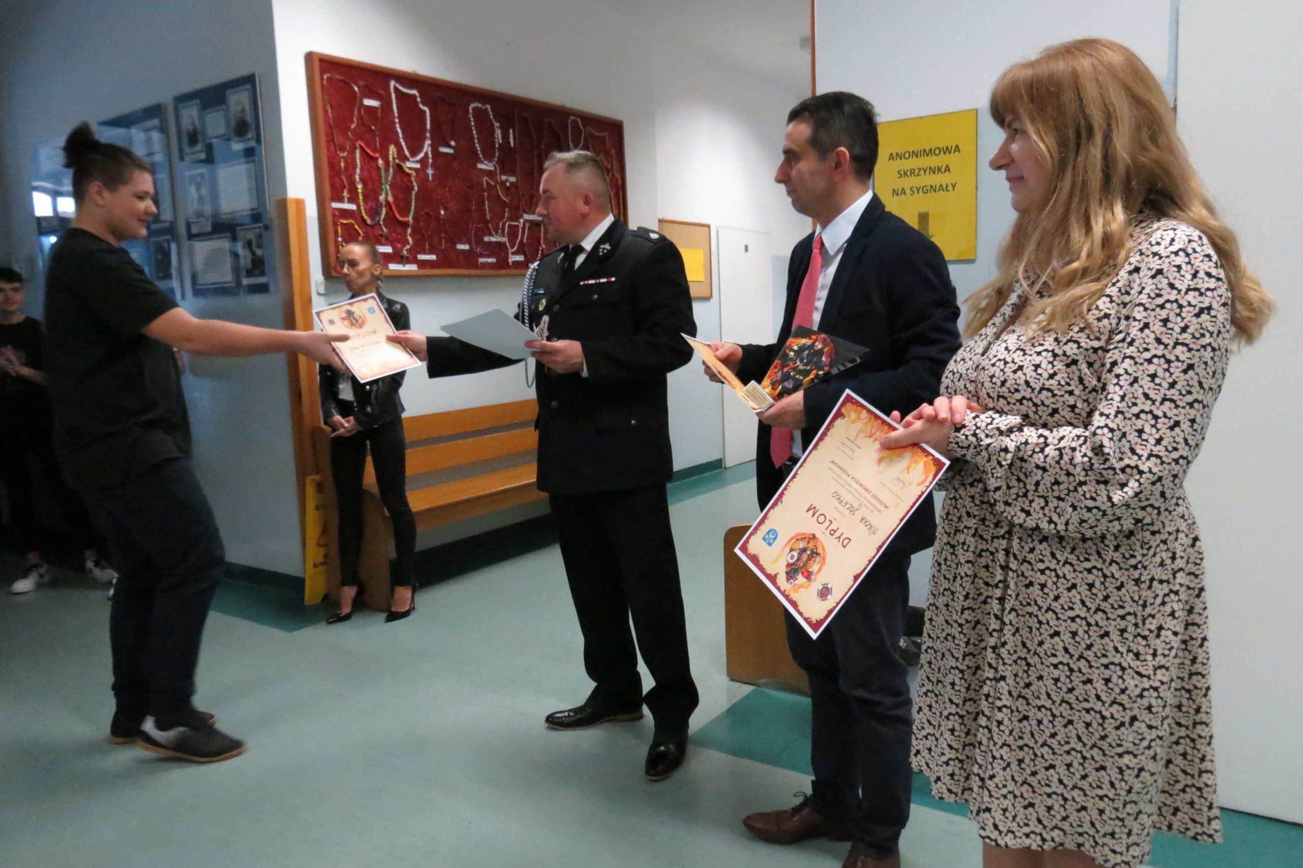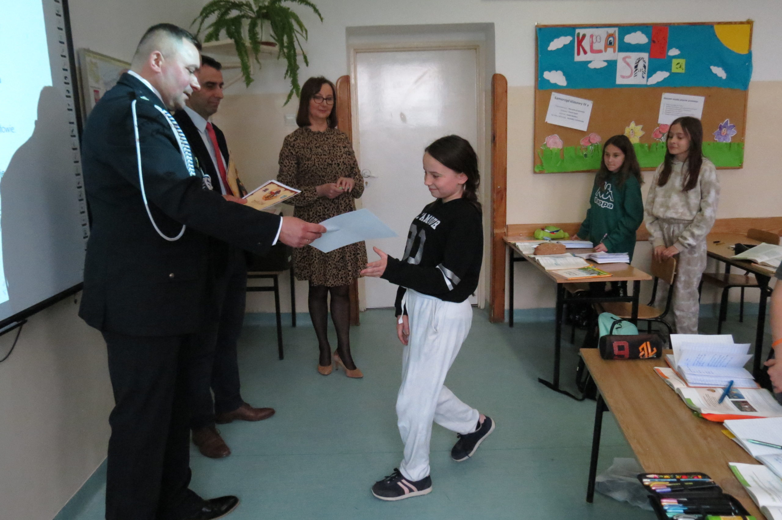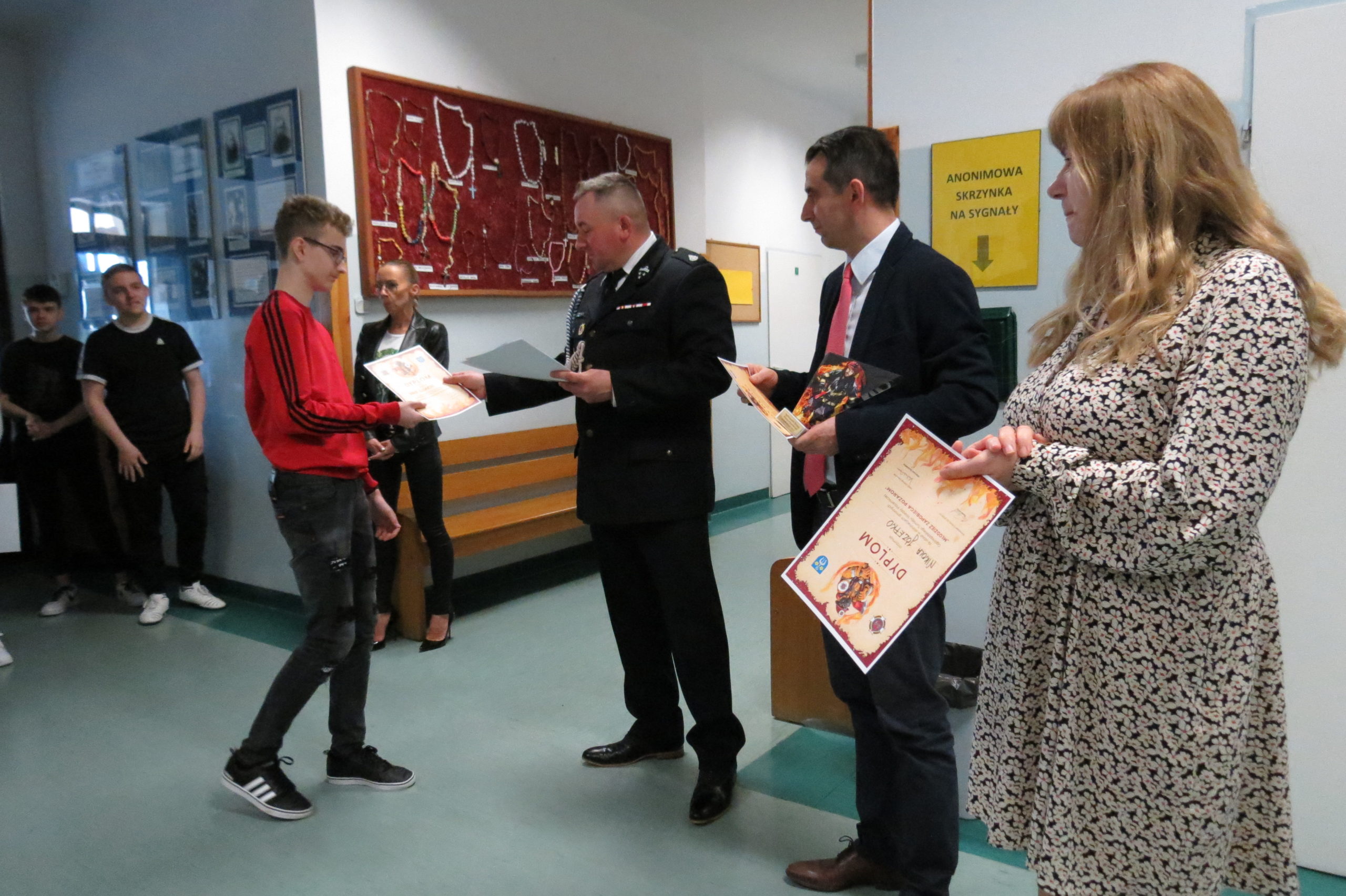 Wręczenie nagród uczestnikom gminnego etapu konkursu odbyło się we wtorek, 26 kwietnia. Dyplomy otrzymali wszyscy uczniowie biorący udział w eliminacjach, a zwycięzcy reprezentujący gminę Łabunie na etapie powiatowym – również statuetki. Wręczali je: Wójt Gminy Łabunie – Mariusz Kukiełka oraz Komendant Gminny OSP – Paweł Mróz.