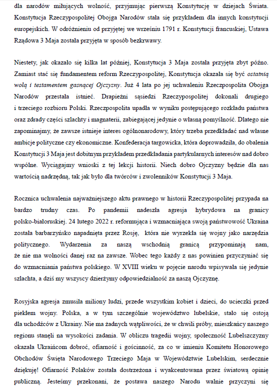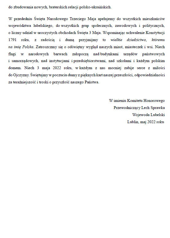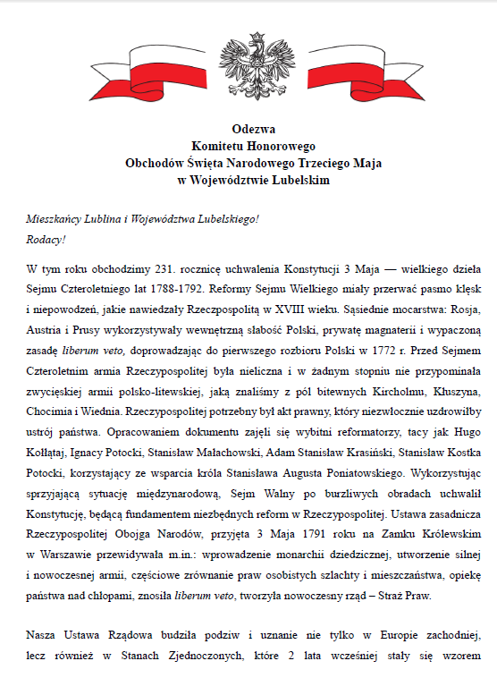 Odezwa Komitetu Honorowego Obchodów Święta Narodowego Trzeciego Maja w Województwie Lubelskim.
