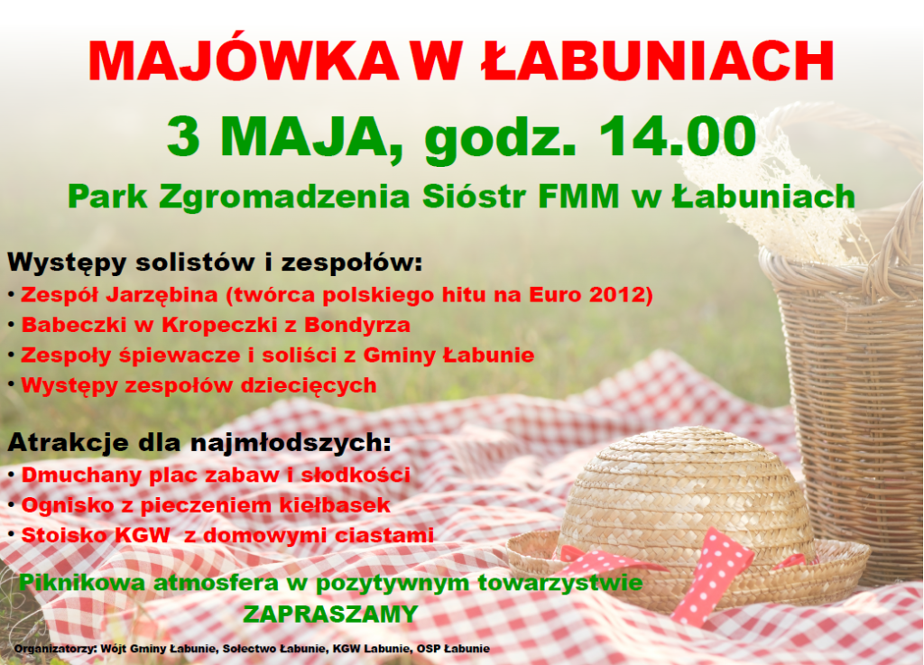 - 3 maja, godz. 14.00 – Majówka w parku zespołu pałacowego w Łabuniach (spójrz na plakat)