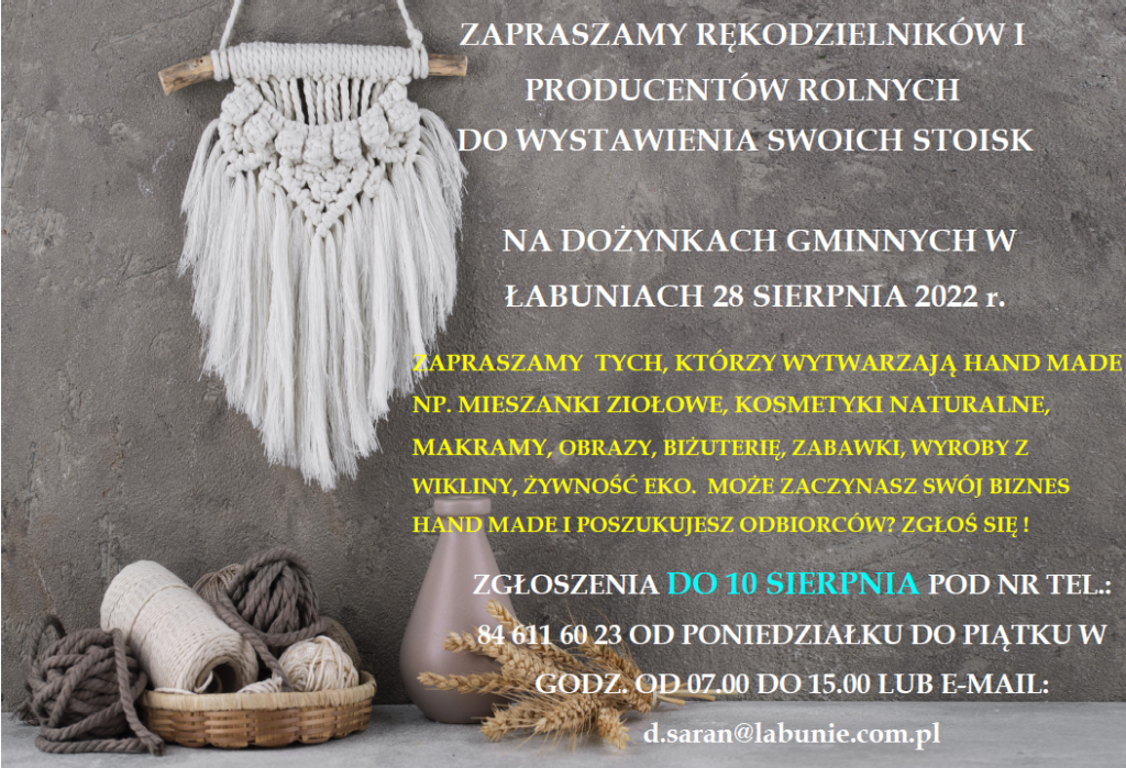 Jesteś rękodzielnikiem, artystą, producentem rolnym, wytwórcą hand made lub eko? Zgłoś swoje stoisko na Dożynki Gminne w Łabuniach, które odbędą się 28 sierpnia 2022 r. Szczegóły na plakacie.