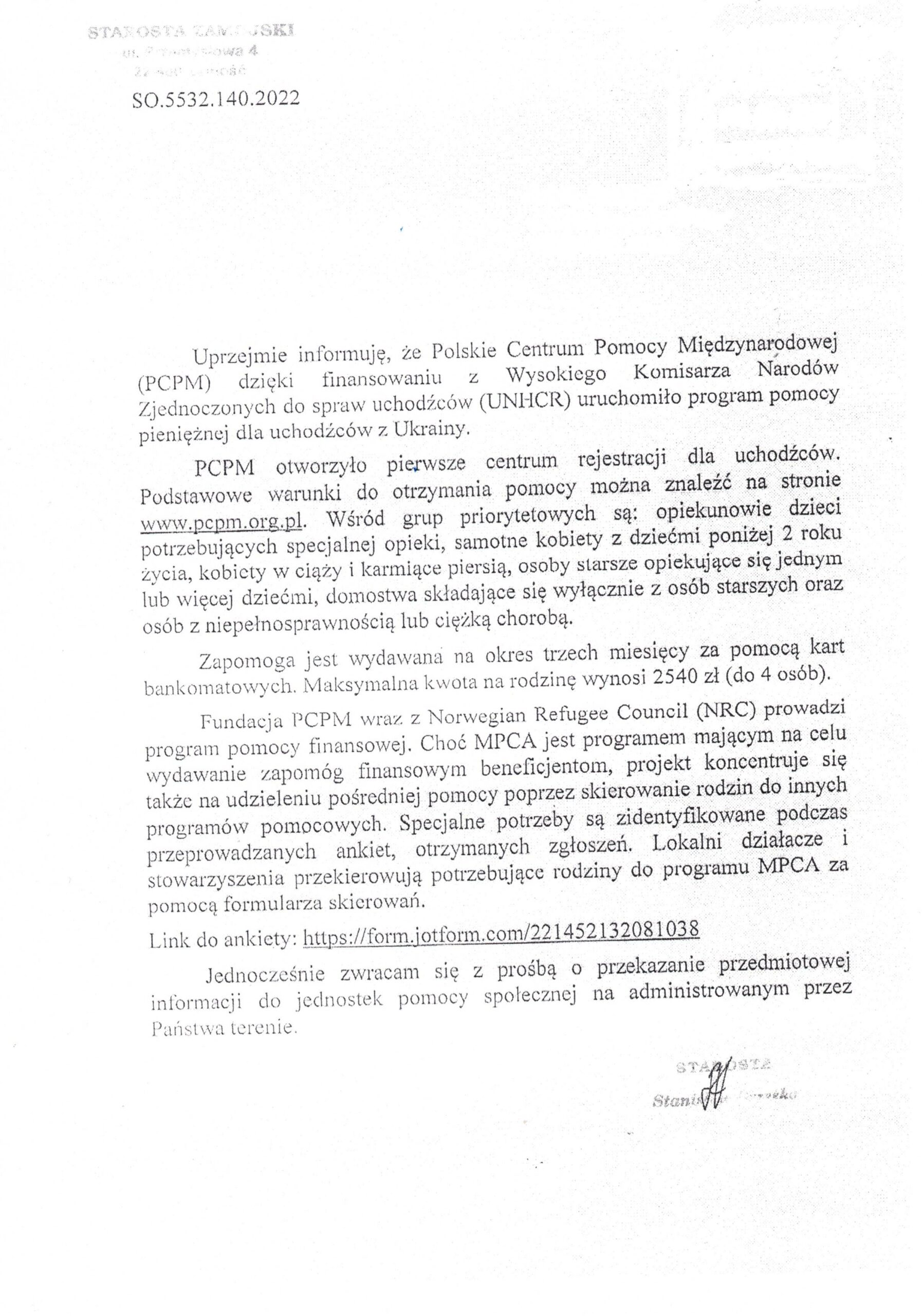 Informacja o programie znajduje się w skanie pisma otrzymanym od Starosty Zamojskiego.