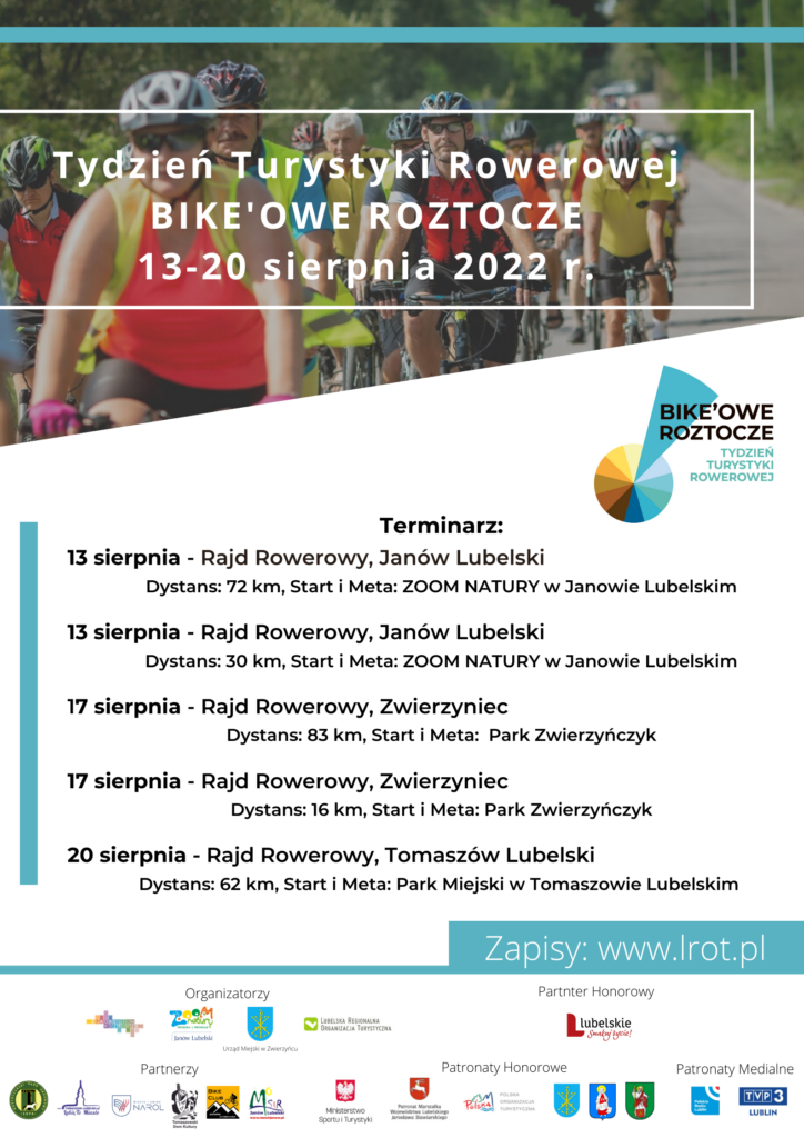 W imieniu organizatorów zapraszamy do wzięcia udziału w rajdach rowerowych realizowanych w ramach wydarzenia pn. “Tydzień Turystyki Rowerowej – Bike’owe Roztocze” przez Lubelską Regionalną Organizację Turystyczną, Gminę Janów Lubelski, Urząd Miejski w Zwierzyńcu oraz Stowarzyszenie Samorządów Euroregion Roztocze.