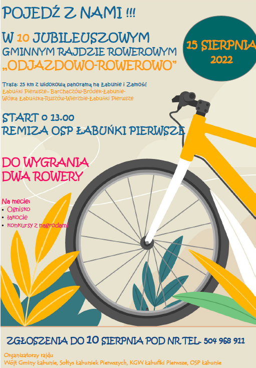 Rajd odbędzie się w poniedziałek, 15 sierpnia. Startujemy o 13.00 spod Remizy OSP w Łabuńkach Pierwszych. Przejedziemy przez Barchaczów, Bródek, Łabunie, Wólkę Łabuńską, Ruszów i Wierzbie. Meta to zespół pałacowo-parkowy w Łabuńkach Pierwszych, gdzie po takiej przejażdżce czeka na uczestników ciepły posiłek, dużo słodkości, konkursy z nagrodami, podczas których będzie można wygrać akcesoria rowerowe. Na koniec – losowanie dwóch rowerów spośród zapisanych uczestników na rajd i niespodzianka z okazji jubileuszu rajdu.
