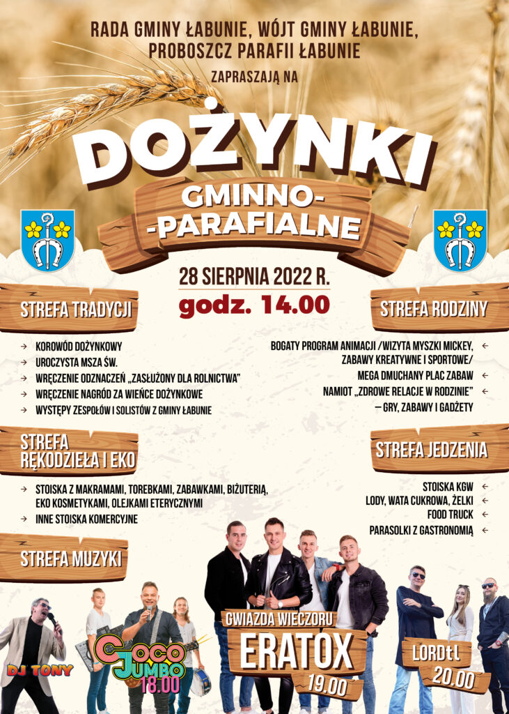Przejażdżki na kucykach, ręczne artykuły z wikliny z Rudnika nad Sanem, biżuteria hand made z Roztocza, wystawa broni tej zabytkowej i nowoczesnej – w sumie 40 stoisk na Dożynkach Gminnych w Łabuniach, a do tego zespoły: Coco Jumbo, GWIAZDA DOŻYNEK – ZESPÓŁ ERATOX i zespół LORDtl do północy. Serdecznie zapraszamy w niedzielę, 28 sierpnia na boisko sportowe przy ul. Parkowej w Łabuniach. Przedstawiamy listę stoisk i plakat z programem Dożynek.