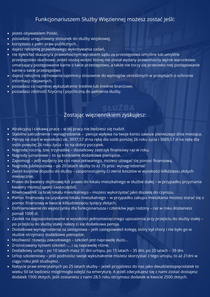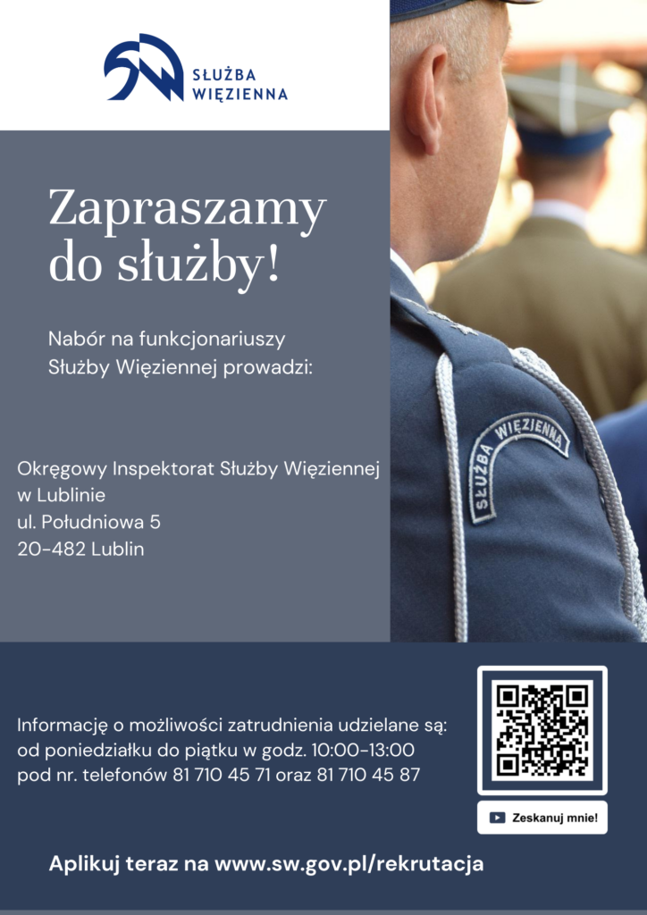 Dyrektor Okręgowy Służby Więziennej w Lublinie ogłasza rozpoczęcie postępowania kwalifikacyjnego do służby w Okręgowym Inspektoracie Służby Więziennej w Lublinie. Szczegóły dotyczące naboru można znaleźć na stronie internetowej: