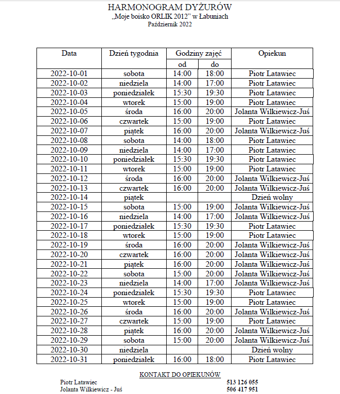 Zapraszamy również na bezpłatne zajęcia sportowe na boisko Orlik w Łabuniach. Tu animatorzy sportowi – Piotr Latawiec oraz Jolanta Wilkiewicz-Juś – organizują zajęcia przez 7 dni w tygodniu w godzinach popołudniowych. Poniżej harmonogram otwarcia boiska Orlik.