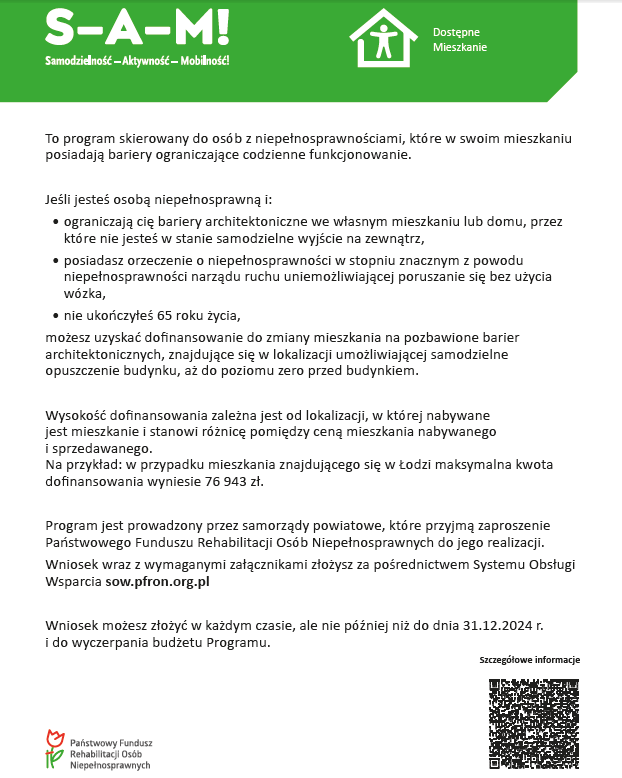 Samorządowy Powiatowe we współpracy z Państwowym Funduszem Rehabilitacji Osób Niepełnosprawnych realizują kolejny moduł programu „Samodzielność-Aktywność-Mobilność!”. Tym razem uwagę zwracamy na moduł „Dostępne Mieszkanie”.