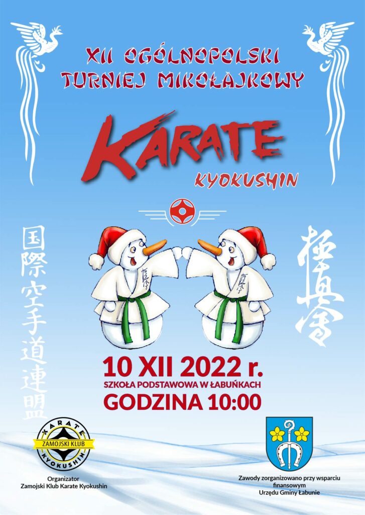 Zamojski Klub Karate Kyokushin zaprasza 10 grudnia 2022 r. do hali sportowej Szkoły Podstawowej w Łabuńkach Pierwszych na XII Ogólnopolski Turniej Mikołajkowy.