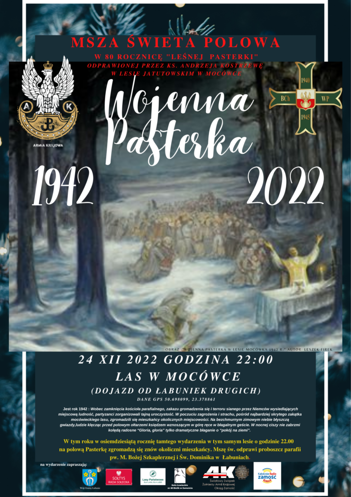To będzie historyczne i wyjątkowe wydarzenie. 24 grudnia o godz. 22.00 zapraszamy na Wojenną Pasterkę z okazji 80. rocznicy “Leśnej Pasterki” odprawionej przez ks. Andrzeja Kostrzewę w lesie jatutowskim w Mocówce. Szczegóły na plakacie.