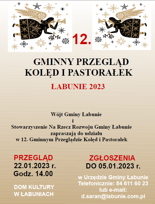 Wójt Gminy Łabunie – Mariusz Kukiełka oraz Stowarzyszenie na Rzecz Rozwoju Gminy Łabunie zapraszają na 12. edycję Gminnego Przeglądu Kolęd i Pastorałek.