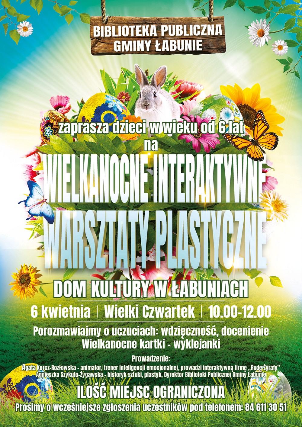 Biblioteka Publiczna Gminy Łabunie zaprasza dzieci w wieku od 6 lat na wielkanocne interaktywne warsztaty plastyczne, które odbędą się 6 kwietnia 2023 r. w Domu Kultury w Łabuniach.