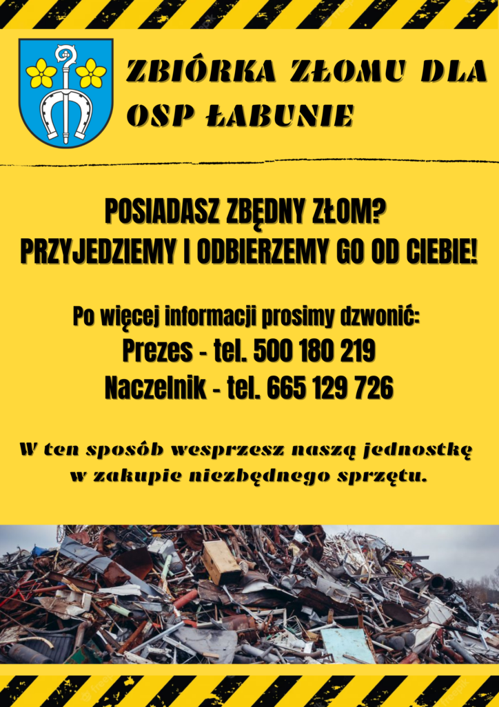 Mieszkańcy gminy Łabunie mogą pozbyć się złomu bez jakiekolwiek wysiłku. Wystarczy zadzwonić pod numer telefonu podany na plakacie. Strażacy z Łabuń przyjadą i zabiorą złom. Dzięki temu będzie można wesprzeć ich jednostkę w zakupie sprzętu, który posłuży m.in. do akcji ratowniczych.