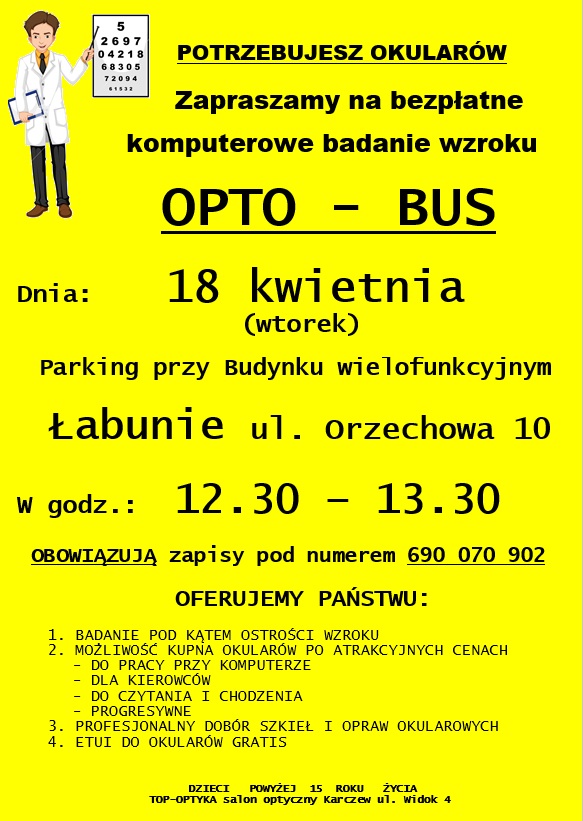 W Łabuniach odbędą się bezpłatne, komputerowe badania wzroku. Już we wtorek, 18 kwietnia. Szczegóły na plakacie.