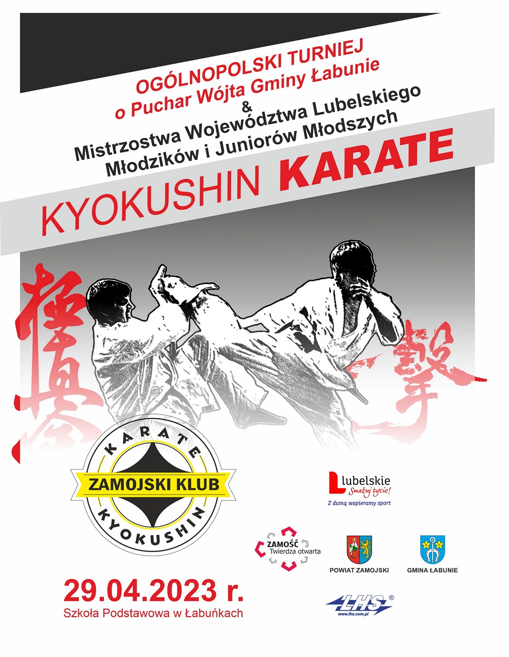 Zamojski Klub Karate Kyokushin zaprasza 29 kwietnia 2023 r. do hali sportowej przy Zespole Szkolno-Przedszkolnym w Łabuńkach Pierwszych, gdzie odbędą się Mistrzostwa Województwa Lubelskiego Młodzików i Juniorów Młodszych oraz Ogólnopolski Turniej o Puchar Wójta Gminy Łabunie.