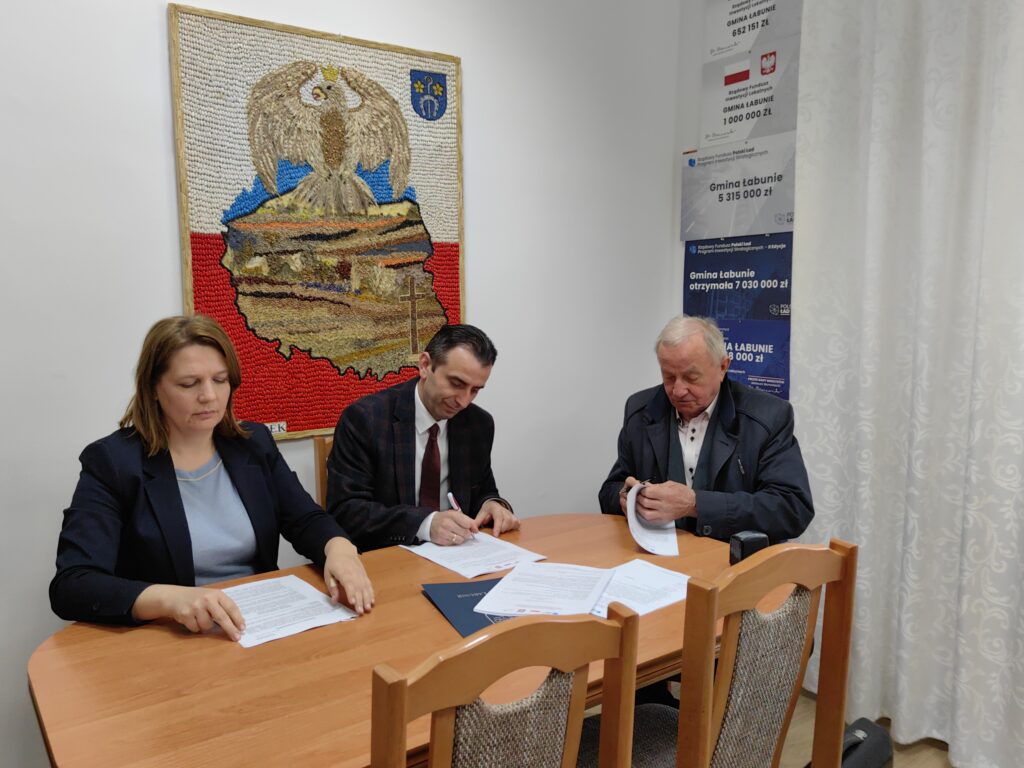 W czwartek, 27 kwietnia w siedzibie Urzędu Gminy Łabunie Wójt Mariusz Kukiełka oraz Skarbnik Gminy Łabunie – Agnieszka Niemczuk podpisali z Wykonawcą umowę na remont 7 km dróg na terenie naszej gminy. Wartość inwestycji to prawie 3 mln 200 tys. zł, z czego ponad 3 mln to dofinansowanie z Rządowego Funduszu Polski Ład:”Program Inwestycji Strategicznych”. Pracami zajmie się wyłonione w drodze przetargu Przedsiębiorstwo Wielobranżowe “SADEX” Janusz Sadlik.