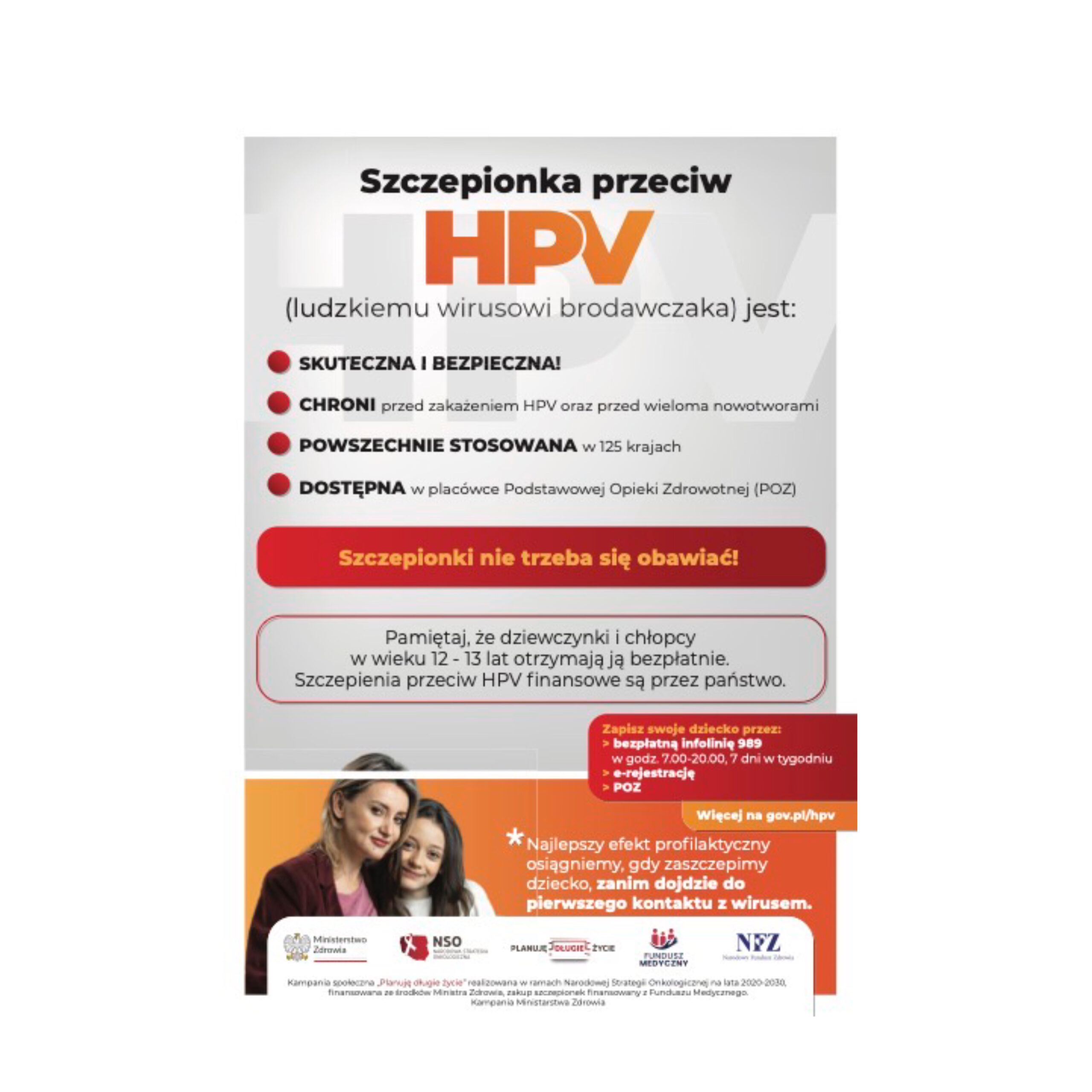 Powszechny program szczepień przeciw HPV realizuje założenia i cele Narodowej Strategii Onkologicznej na lata 2020-2030. Uzupełnia bezpłatny program szczepień ochronnych dla dzieci i młodzieży o szczepienie, które chroni przed chorobami wywołanymi przez HPV.