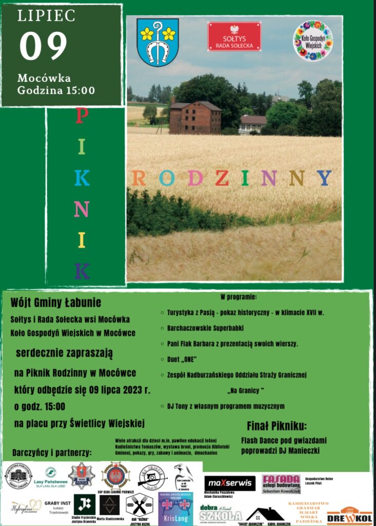Zapraszamy mieszkańców gminy Łabunie na piknik do Mocówki – już 9 lipca. Szczegóły na plakacie.